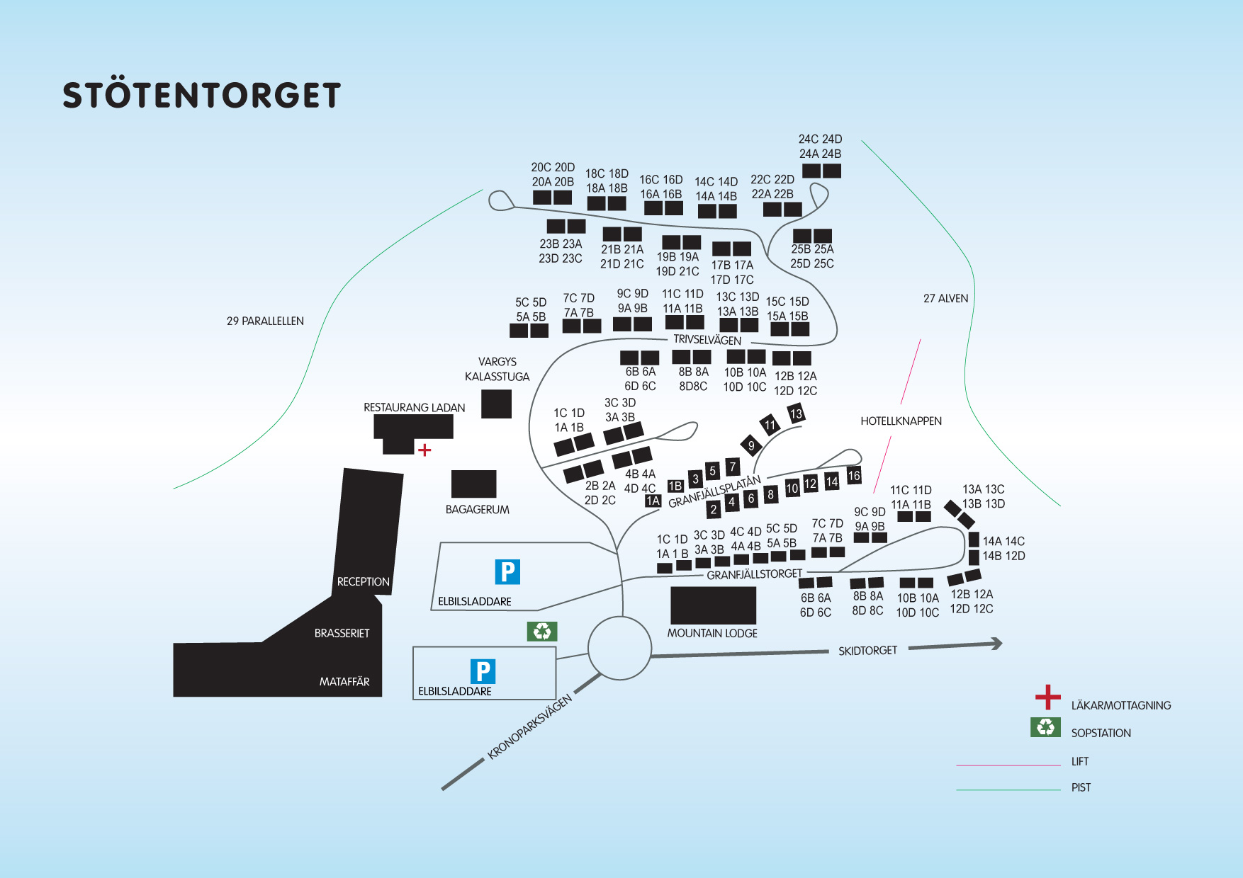 Pistbyn (Trivselvägen) er fine hyttelejligheder med en af Stöten bedste beliggenheder med piste på hver side af hyttebyen.